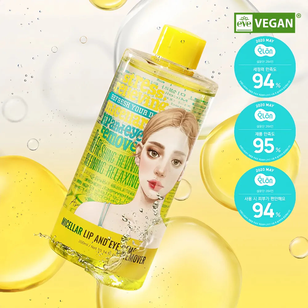 ARIUL Stress Relieving Micellar Lip and Eye Remover 300ml is a mild, targeted micellar water designed to remove stubborn eye and lip makeup (e.g., waterproof mascara, long-lasting lipstick) while soothing sensitive skin. Its core efficacy lies in the "micellar deep cleansing + stress-relieving soothing + eye-lip gentle care" triple system: