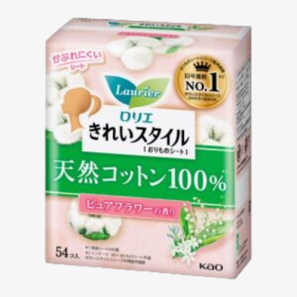 KAO LAURIER Sanitary Pantyliner Cotton Flower 14cm 54pcs is made of 100% natural cotton. The surface layer is fluffy and soft, which can absorb secretions and keep you comfortable and fresh for a long time. It has an approximately 1mm - thick ultra - thin instant - absorption layer and a breathable bottom film to keep you away from the trouble of stuffiness and wetness. The pad is not easy to shift, providing a comfortable experience for the skin