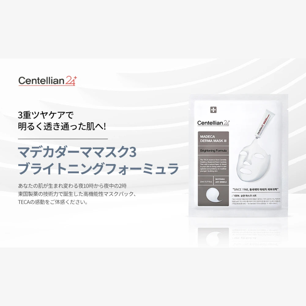 Centellian 24's Madeca Derma Mask III Brightening Formula is a premium sheet mask designed to enhance skin clarity and radiance. Formulated with TECA (Titrated Extract of Centella Asiatica) and Alpha-Bisabolol, it soothes and repairs damaged skin, promoting a healthier complexion.