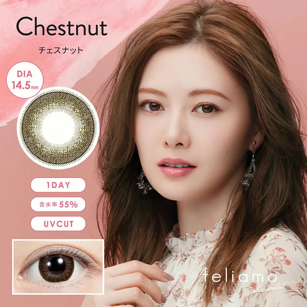 FELIAMO Daily Contact Lens (Chestnut) (10 Lenses) -6.50 is a natural-colored contact lens designed for daily commuting and light makeup scenarios. The chestnut color, a dark brown with warm tones, fits the pupil base color of Asians. The 13.3mm colored diameter achieves natural pupil blending, creating a gentle and profound "natural-born" eye makeup effect with moderate and non-abrupt magnification. Made of non-ionic silicone hydrogel material, the high oxygen permeability coefficient ensures corneal breathing, and paired with sodium hyaluronate moisturizing ingredient, it is not easy to dry during long-term wearing. The aspheric design and 8.7mm base curve are suitable for most Asian eye shapes, and the smooth and angular-free lens edge ensures comfortable wearing without foreign body sensation. The independent sterile packaging is hygienic and convenient, and the daily disposable design requires no care, making it an ideal choice for people pursuing natural beauty and practicality.