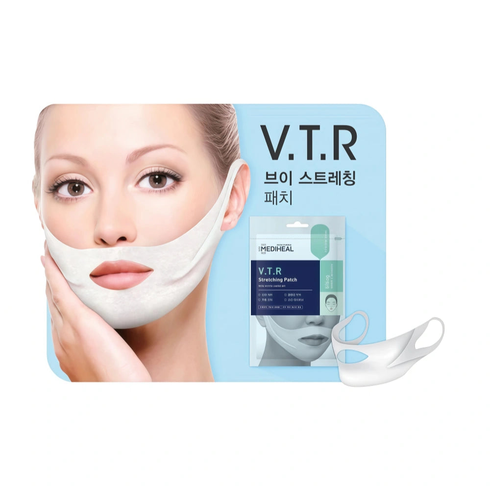 - Le patch stretching VTR V-Line de Mediheal contient du collagène hydrolysé, de l'adénosine et de la caféine comme principaux ingrédients.