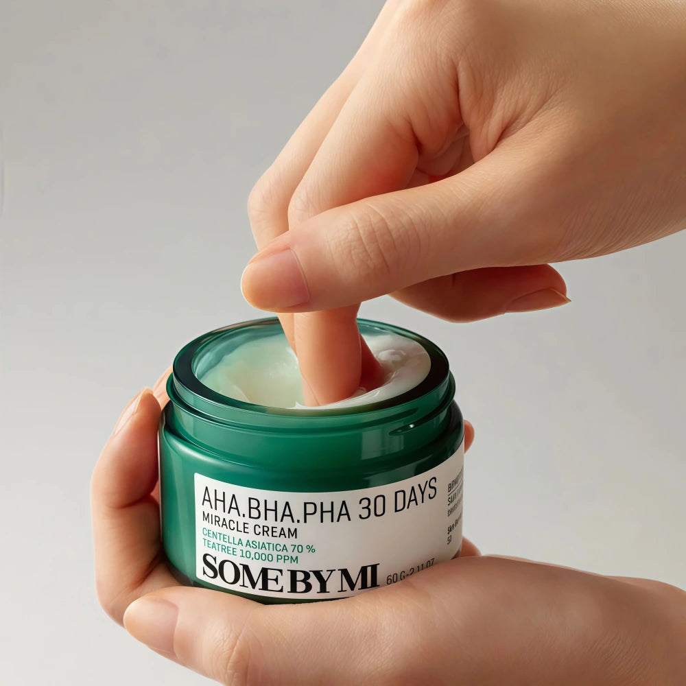 La Crème Miracle 30 Jours de SOME BY MI est une crème apaisante et revitalisante conçue pour améliorer l'éclat et la texture de la peau en seulement 30 jours. Enrichie en extrait d'arbre à thé, AHA, BHA et PHA, cette crème exfolie en douceur les cellules mortes, désobstrue les pores et atténue les imperfections, pour une peau plus lisse et un grain de peau affiné. Elle hydrate intensément, apaise les irritations et contribue à un teint plus clair et lumineux. Idéale pour les peaux à tendance acnéique ou à problèmes, elle régule l'excès de sébum tout en nourrissant la peau et en renforçant son élasticité. Légère et non grasse, elle pénètre rapidement et laisse la peau douce, hydratée et rafraîchie. Parfaite pour un usage quotidien, cette crème aide à conserver un teint plus sain et plus net avec une utilisation régulière. Convient à tous les types de peau, en particulier aux peaux à imperfections ou présentant un teint irrégulier.