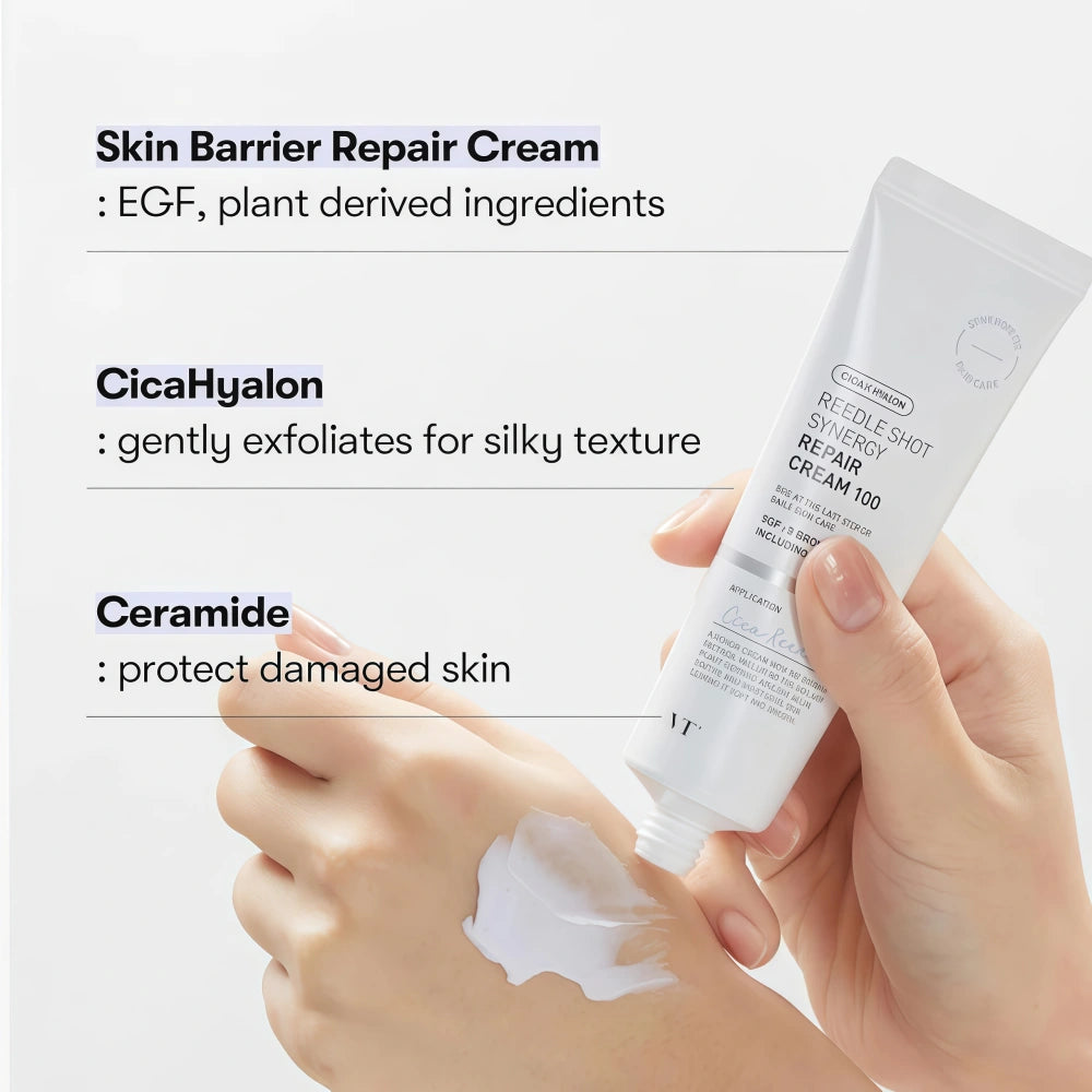 Découvrez le pouvoir des soins de la peau avancés avec la crème réparatrice VT Reedle Shot Synergy Repair (50 ml) . Spécialement formulée avec le système innovant en 3 étapes CICA REEDLE Synergy Repair, cette crème nourrissante associe EGF, 9GF et azulène pour transformer la texture et l'élasticité de votre peau.