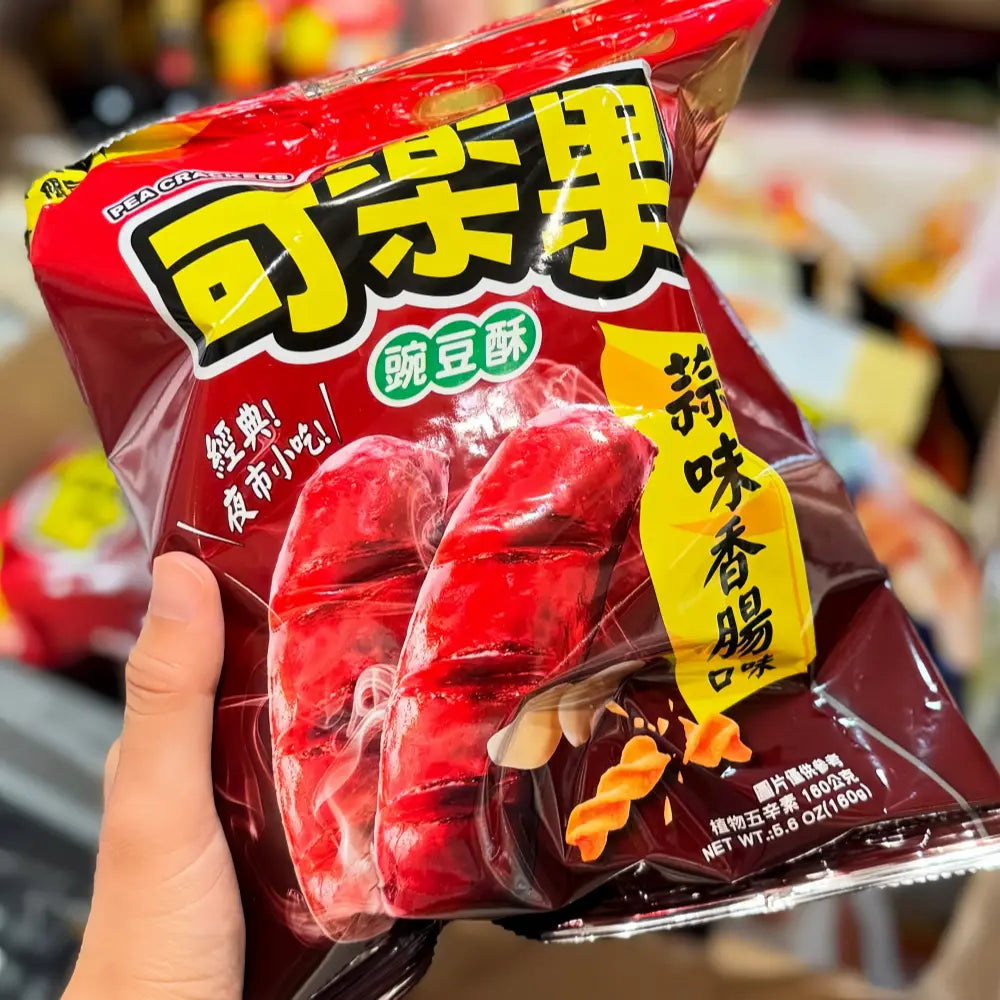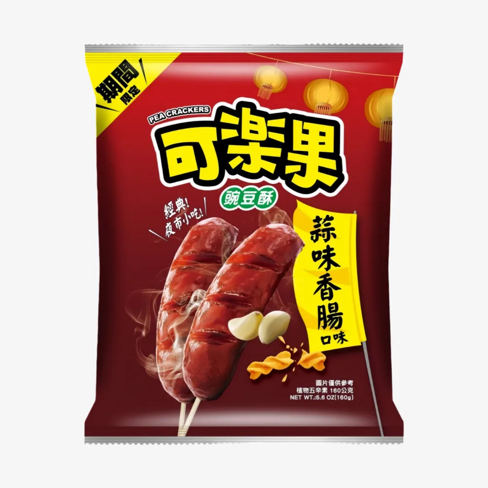 KLG (Karoko) Garlic Sausage Flavor Pea Crackers is a Taiwan night market limited-flavor snack of the "Karoko" brand. Made with peas as the base material, it is puffed into crispy pea crackers, paired with real garlic sausage seasoning powder to restore the savory garlic flavor of Taiwan night market grilled sausages. It has a fluffy and crispy texture, rich savory taste without greasiness. The product replicates the shape of grilled sausages, combining fun and flavor, free of synthetic artificial colors, with authentic and natural taste, suitable for scenarios such as movie watching, picnics and office snacks. The 160g large capacity is suitable for sharing. With rich local Taiwanese flavor and crispy texture, it has become one of the popular Taiwanese leisure snacks, enjoying an excellent reputation in the Asian snack market.