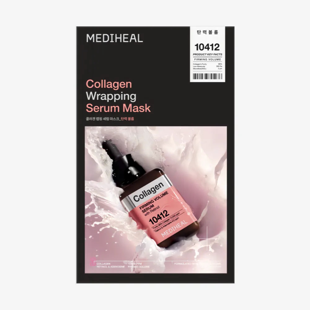 MEDIHEAL Collagen Wrapping Serum Mask is a high-concentrated firming sheet mask infused with 98% pure low-molecular collagen. It features an ultra-fine microfiber wrapping sheet that fits tightly to lock in essence and boost absorption. The formula deeply replenishes collagen, enhances skin elasticity, reduces fine lines and sagging, and delivers instant plumping and long-lasting hydration. Infused with hydrolyzed collagen, peptides, and hyaluronic acid, it revitalizes dull skin, improves texture, and restores a smooth, bouncy, and radiant complexion美迪惠尔. Suitable for all skin types, especially those with loss of elasticity and dryness.