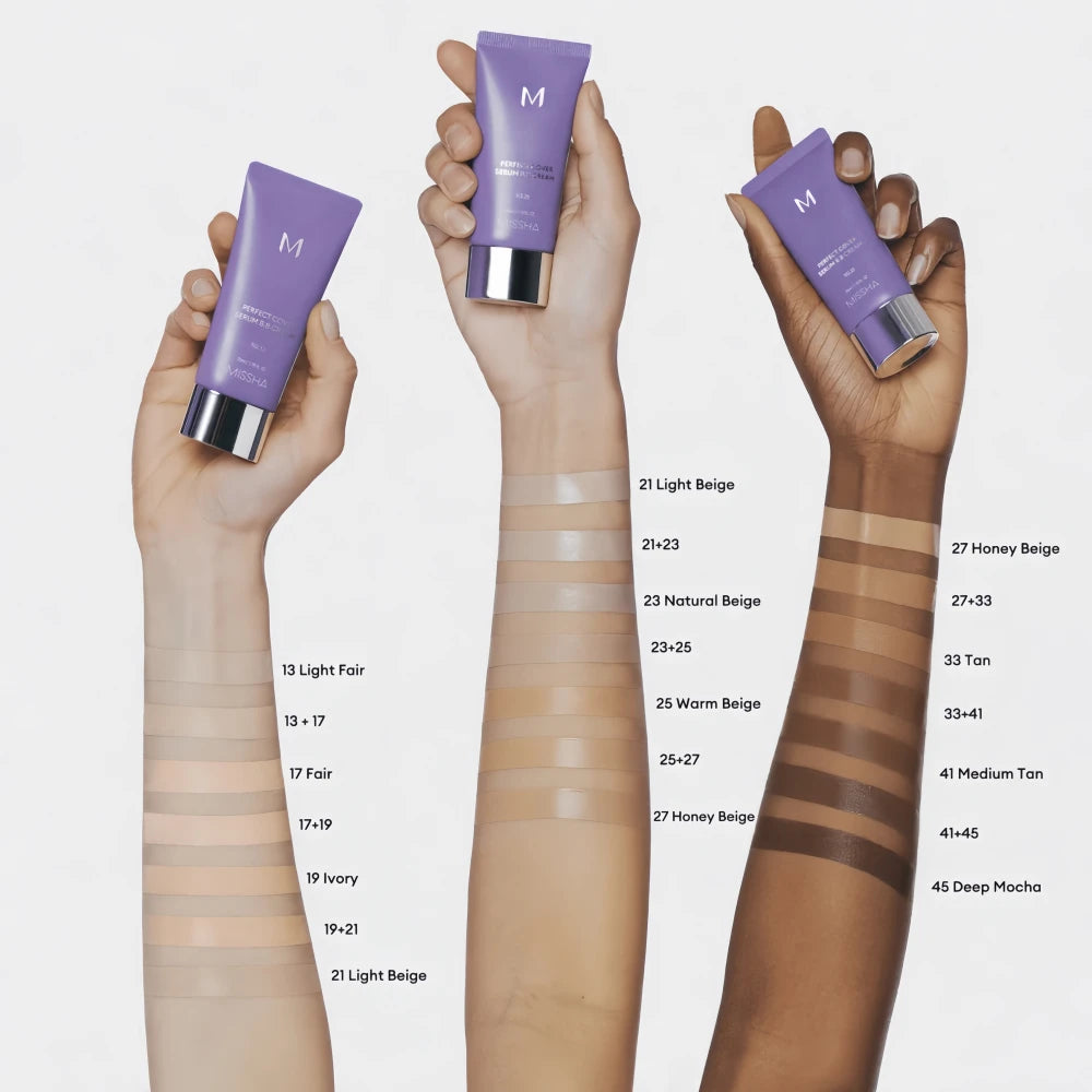 MISSHA Perfect Cover Serum BB Cream No 27 is a classic best-seller of the brand, focusing on "skincare-grade makeup + cost-effectiveness". It contains moisturizing ingredients such as sodium hyaluronate and panthenol, nourishing the skin while applying makeup to avoid dryness and powder caking; the high-coverage formula can cover blemishes such as acne scars, red blood vessels, and pores, creating a natural flawless makeup look; SPF42/PA+++ sun protection index meets daily sun protection needs, isolating UV rays and external pollution. The lightweight texture is easy to spread, presenting a matte finish after setting, with strong wear resistance and no easy fading. Suitable for daily commuting, dating and other scenarios, it is an essential makeup item with both practicality and convenience.