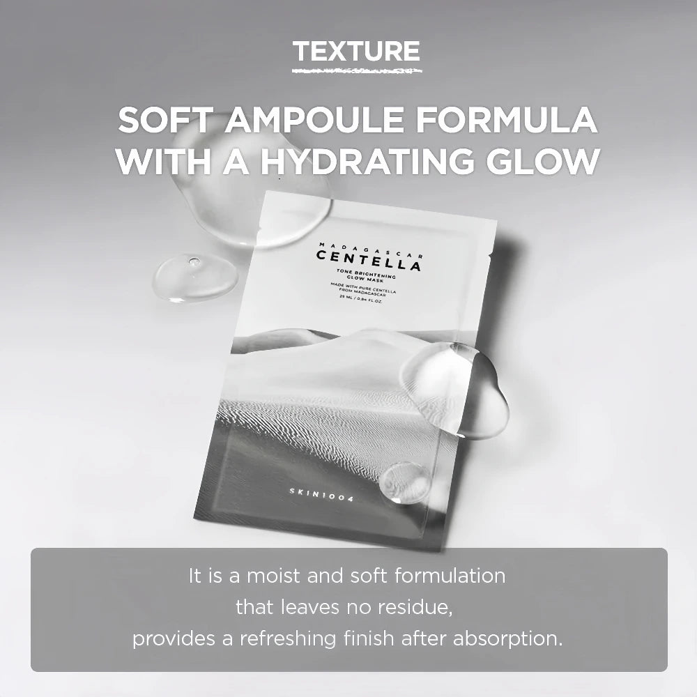 SKIN1004 Madagascar Tone Brightening Glow Mask 5pcs is a natural brightening sheet mask focusing on "even skin tone + radiant glow", specially developed for dull, uneven, or lackluster skin caused by UV damage, staying up late, or environmental pollution. It takes high-purity Centella asiatica extract from Madagascar (the brand’s signature ingredient) as the core, which is rich in madecassoside and asiaticoside—these active compounds not only soothe the skin and repair the barrier but also help inhibit the production of melanin precursors, reducing dark spots and dullness. The mask is also formulated with a "brightening complex" including niacinamide, tranexamic acid, and vitamin C derivatives: niacinamide regulates keratin metabolism to even skin tone, tranexamic acid fades existing dark spots, and vitamin C derivatives provide mild whitening effects without irritating the skin. The mask sheet is made of "eco-friendly plant fiber" material, which is thin, breathable, and has strong essence-locking ability—it fits closely to facial contours (even around the nose wings and jawline) to ensure the brightening essence is fully absorbed. It is free from parabens, artificial fragrances, alcohol, mineral oil, and synthetic colorants, making it suitable for most skin types, including sensitive skin in need of gentle brightening.