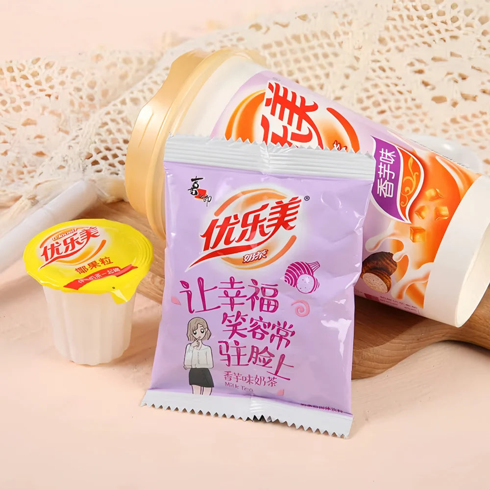 This taro-flavored instant milk tea is a popular product of ULoveit, which accurately meets the daily snacking and casual drinking needs of young people. It combines rich milk aroma, fresh tea flavor and sweet taro taste, which is sweet but not cloying with a smooth texture. The matched crystal-clear nata de coco adds a chewy texture and enriches the taste layers. Following the brand's classic cup design, the product is easy to brew without additional utensils. It can be quickly enjoyed during office breaks, campus rest or travel. Its raw materials have passed strict inspections, and the non-dairy creamer contains no trans fatty acids, meeting health standards, making it a delicious and convenient daily casual drink.
