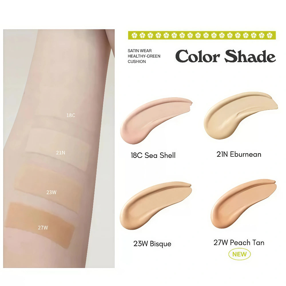 Unleashia Satin Wear Healthy - Green Cushion 18C Seashell is a cushion foundation with a semi - matte satin finish. It offers medium coverage and a lightweight, natural look. It has skin - care benefits to help achieve healthy skin and provides sun protection of SPF30 PA++. This cushion is enriched with various skin - soothing and nourishing ingredients, such as papaya fruit extract, bakuchiol, parsley extract, and chamomile flower extract. These ingredients work together to hydrate, soothe the skin, and promote skin elasticity and regeneration. Niacinamide and bakuchiol help keep the skin smooth and pimple - free even after makeup. In addition, it uses hygienic airless packaging to reduce the contamination common in traditional cushion foundations. The formula is vegan, fragrance - free, breathable, lightweight, and applies evenly, without making the skin feel or look dry, greasy, or heavy.