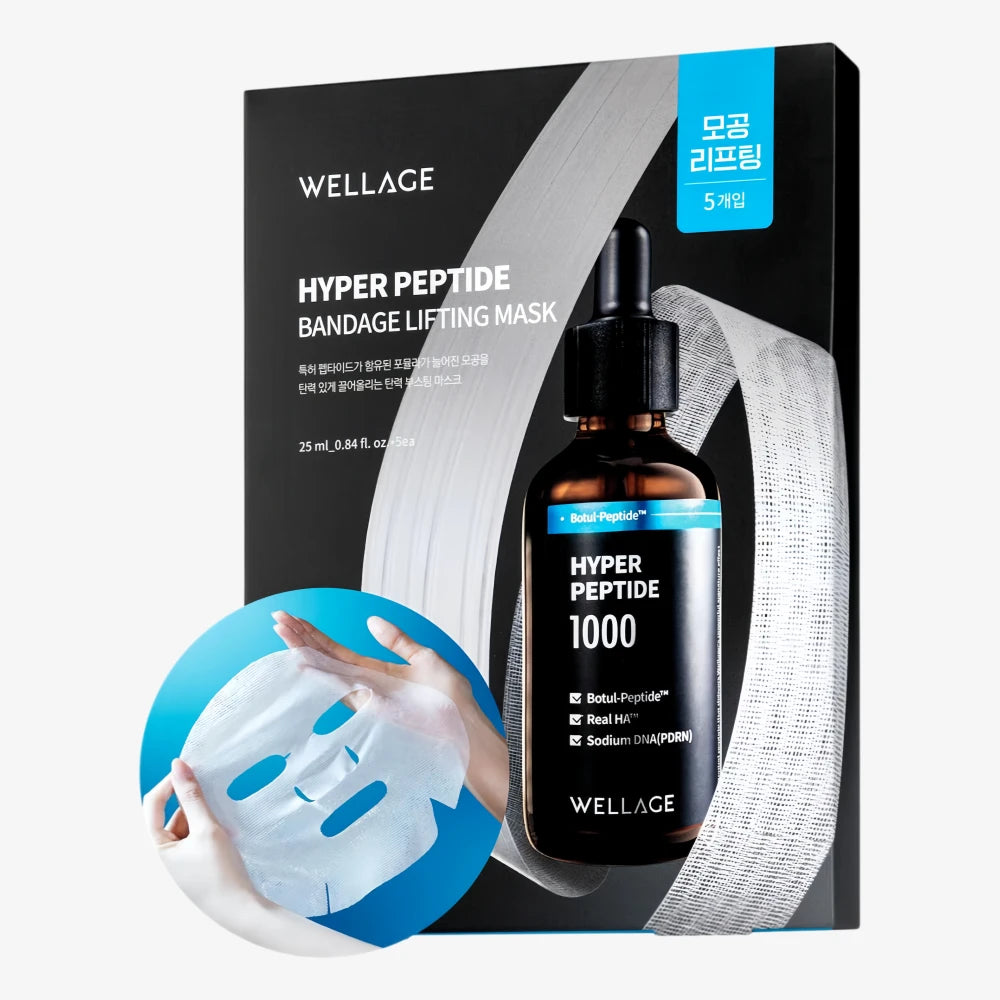 WELLAGE Hyper Peptide Bandage Lifting Mask is a professional-grade lifting mask infused with patented Botul-Peptide complex, PDRN, and hyaluronic acid. It delivers instant firming and contouring effects, targeting sagging skin, fine lines, and enlarged pores. The micro-hole cotton gauze sheet ensures deep essence penetration, boosting collagen synthesis and restoring skin elasticity. Dermatologically tested and hypoallergenic, it’s suitable for all skin types, providing salon-quality lifting and anti-aging results in just 10–20 minutes of home use.